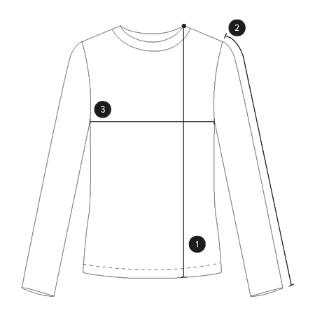 ③ Ancho: Es la medida del ancho de la prenda extendida sobre una superficie plana, tomando la distancia justo debajo de las sisas ( 90 cm ).